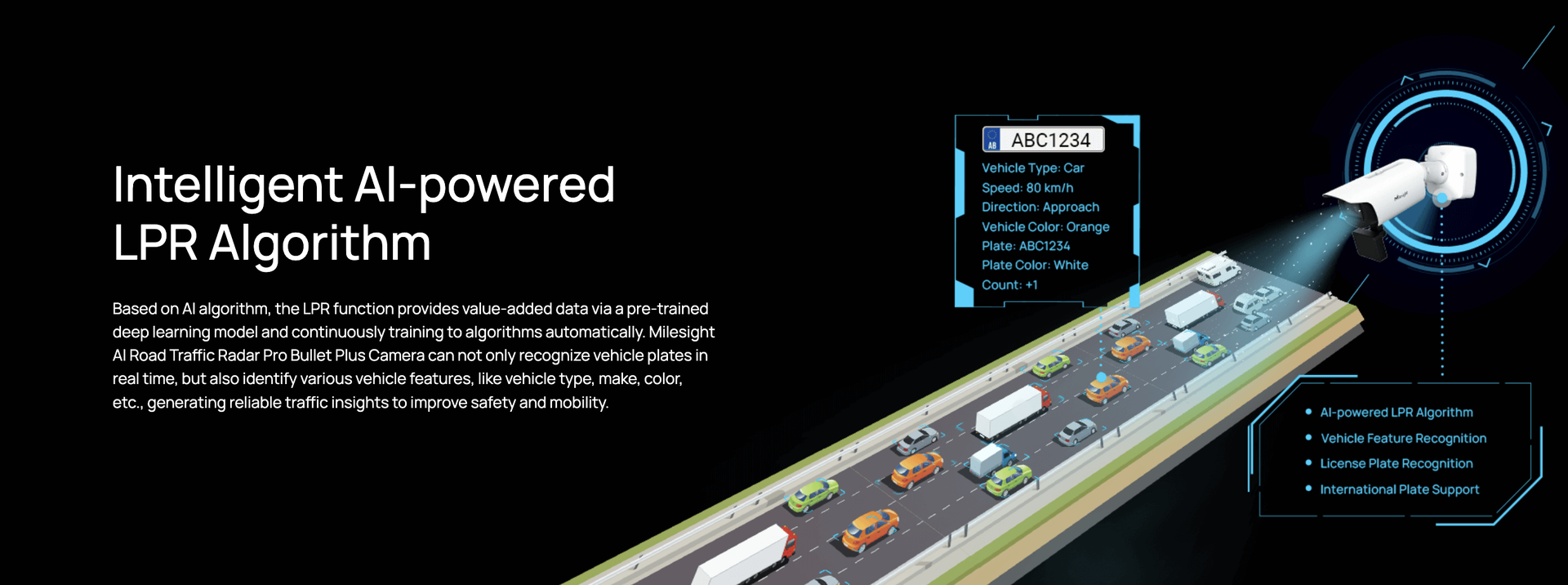 | Attributes Identification | Plate Color, Vehicle Type, Vehicle Color, Vehicle Brand, No-plate Vehicle Capture, Vehicle Direction Detection, Speed Detection * Vehicle Color and Plate Color identification are not supported in low-light or night conditions. |
